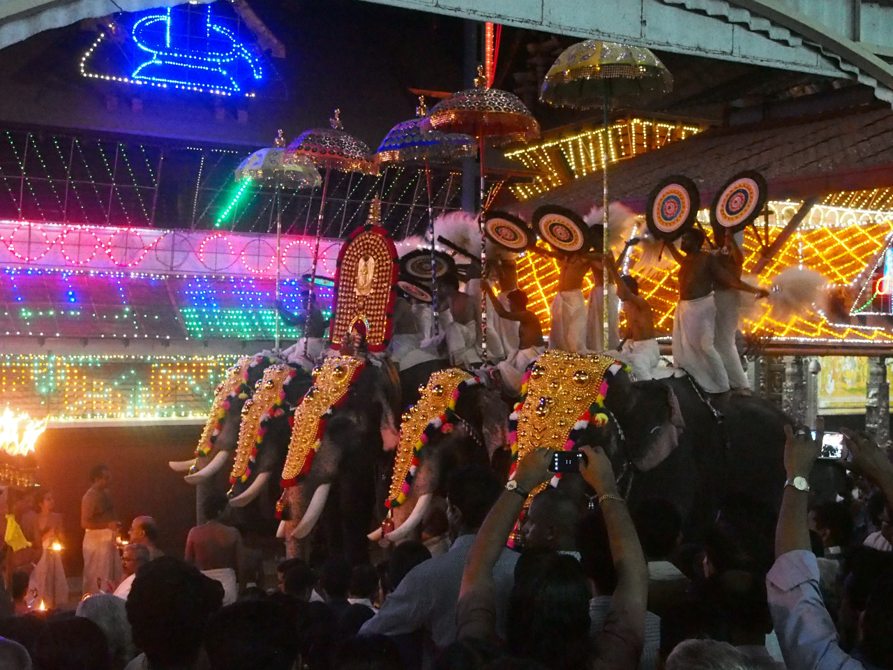 C’est au Kerala que se trouve la petite ville de Gurawayur, où je suis tombé en pleine fête des moissons du riz. Un moment fort que se retrouver au milieu d’une foule de milliers de personnes pour un Pooram (rassemblement), venue remercier leurs dieux pour les bonnes récoltes.