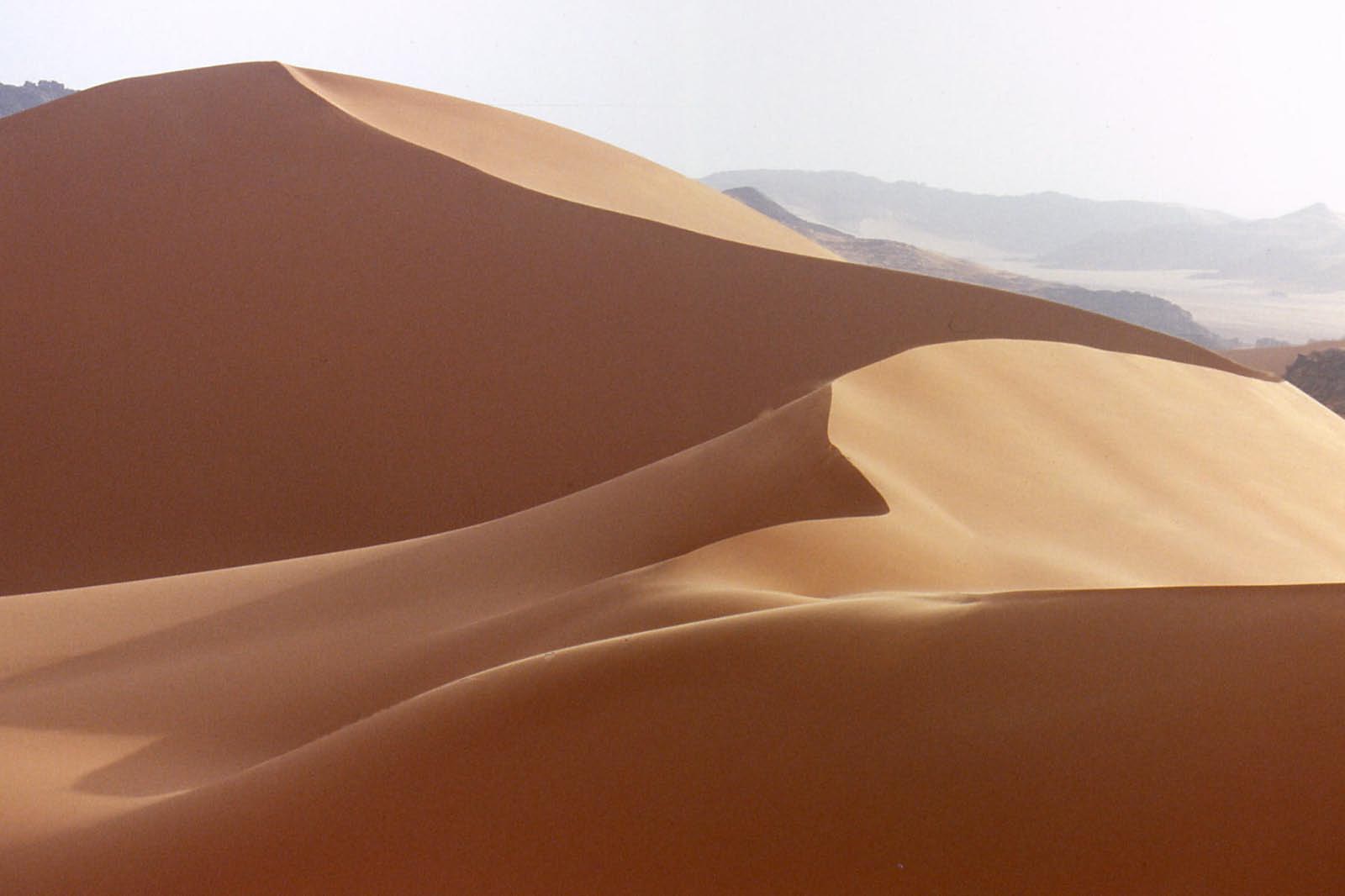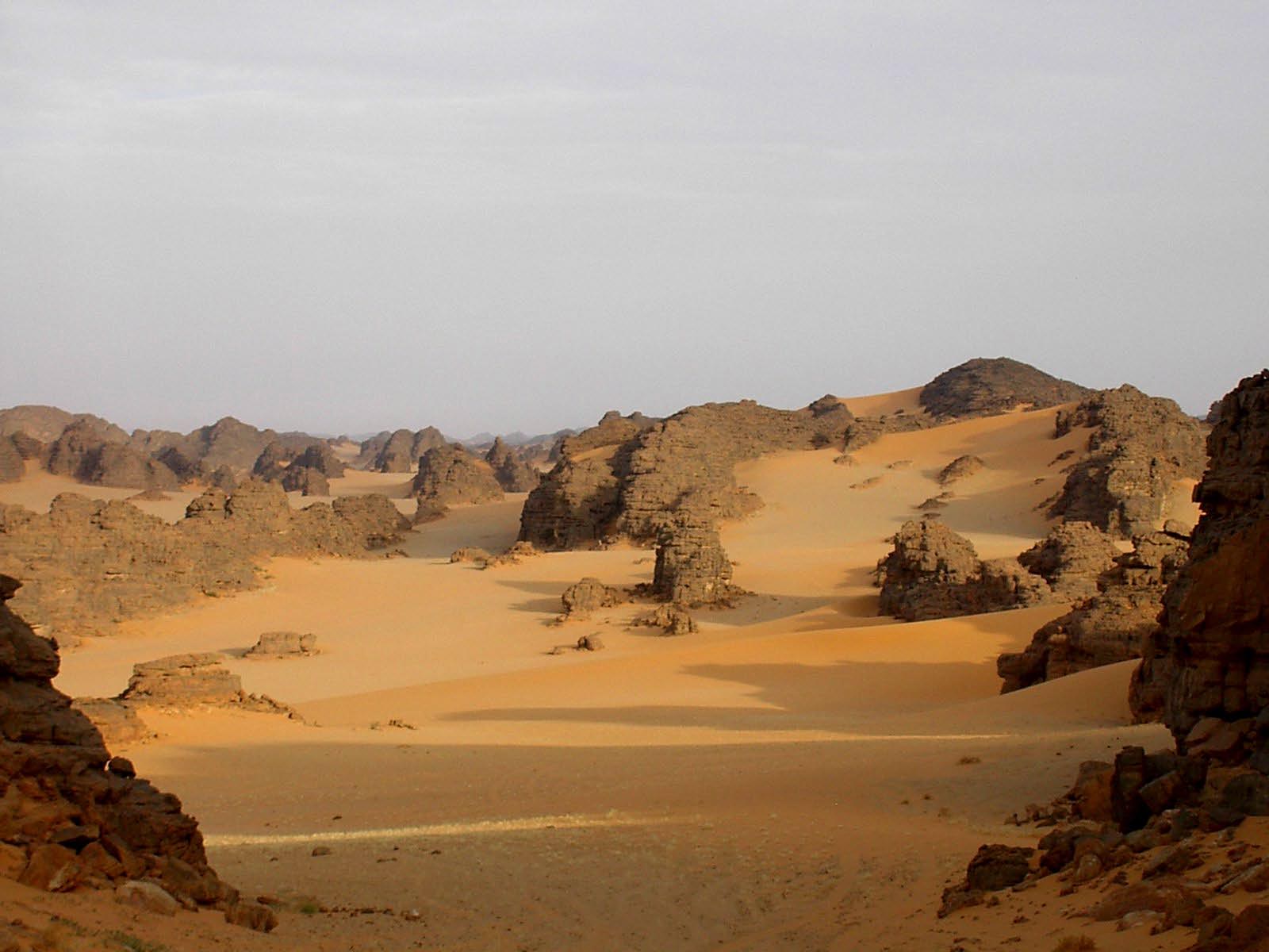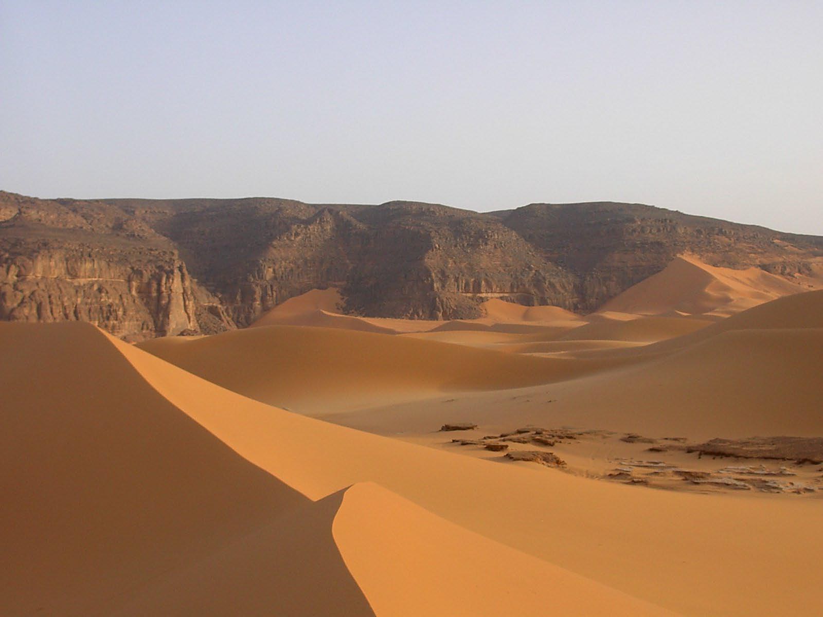 Dans cette région au sud-est de Djanet, dans l’extrême sud algérien, le mythe des belles dunes venues mourir sur les falaises du plateau (Tassili) se concrétise en de belles perspectives accentuées par les levés et les couchés de soleil.