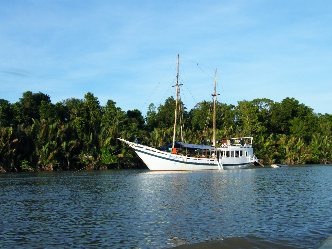 Le Caman (Chaman) est un bateau du type Pinisi (catégorie indonésienne). Ces navires de transport traditionnels construit aux Célèbes ont une coque à faible tirant d’eau. Celui qui a été aménagée par Etienne pour faire des croisières touristiques autour de Bali ou dans les îles de la sonde, nous servira précieusement de « camp de base « pour rayonner à travers les marais et mangrove et remonter les rivières de l’intérieur du pays Asmat.