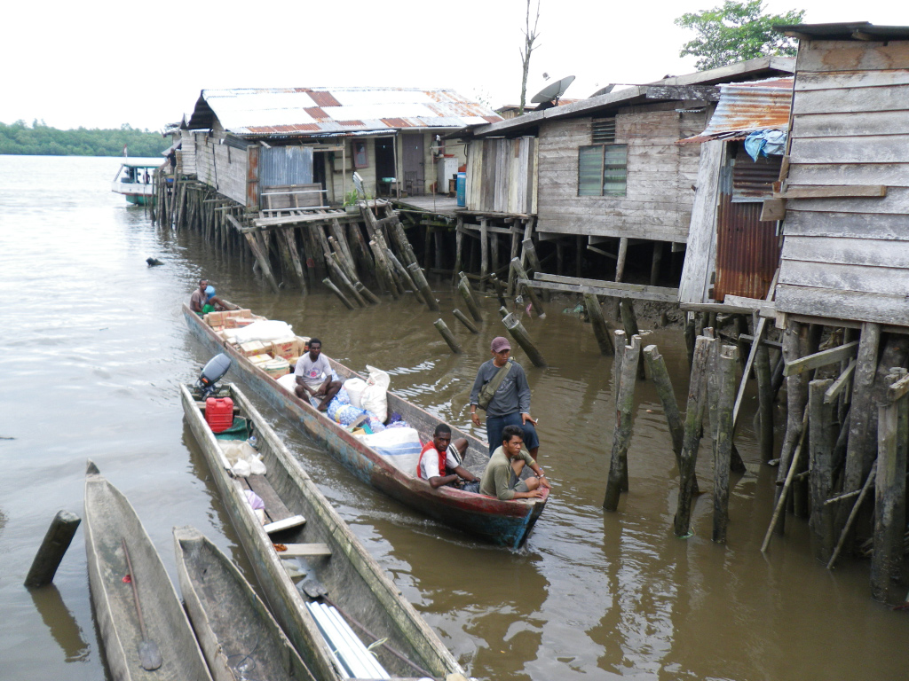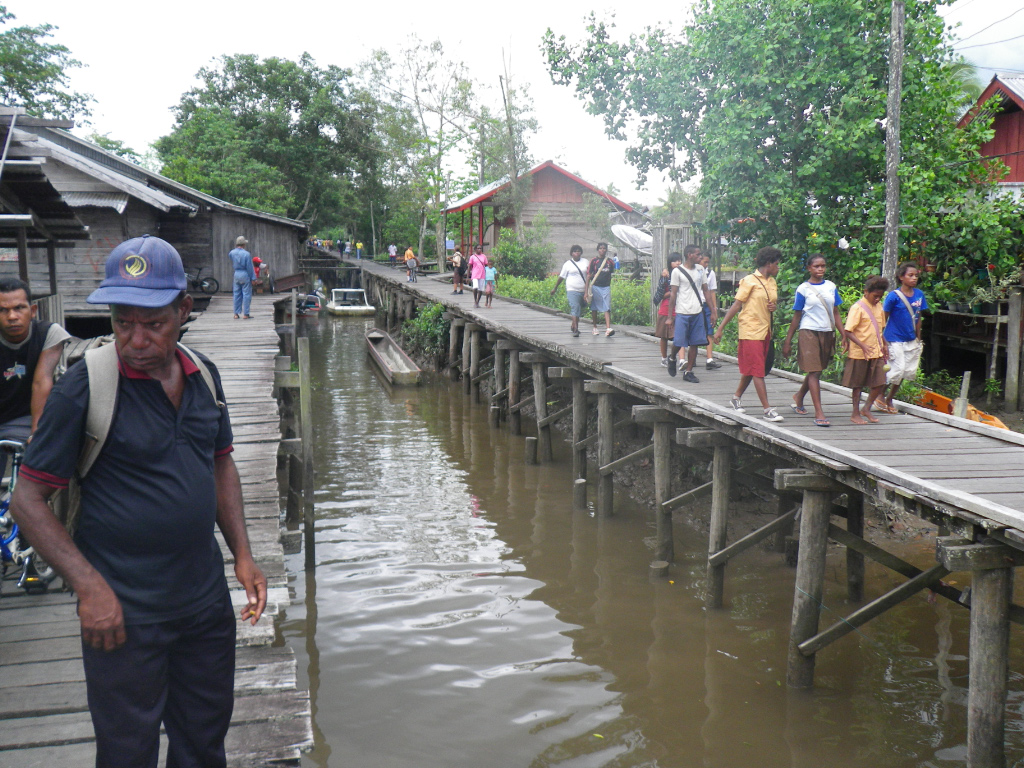 Ce n'est pas la première fois que je me rends à Agat. Nous y sommes allés cette fois-ci, depuis la ville minière de Timika, seul aéroport du sud possible depuis Bali (via les Célèbes). Au bout d'une nuit en mer c'est l'arrivée en vue de cette petite ville, chef-lieu administratif du pays Asmat, fondée par les hollandais il y a une centaine d'année est restée très étonnante. Elle est en effet entièrement construite sur des pilotis, aussi bien les maisons que les passerelles qui servent de rue entre les blocs d'habitations. Il n'y a pas de quai pour les bateaux, seulement des appontements incertains pour les pirogues et petits hors-bords sur motorisés qui font la liaison avec la petite piste d'atterrissage de Ewe à quelques kilomètres, de l'autre cote de l'estuaire du fleuve au bord duquel se situe Agat.