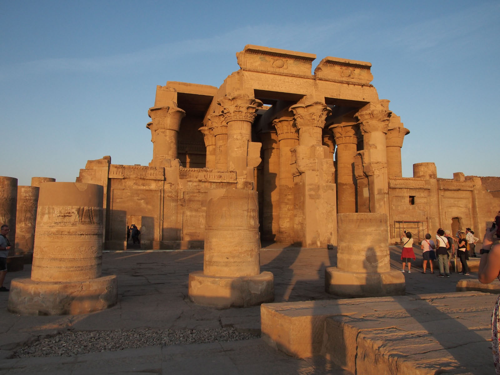 Nous naviguons ensuite jusqu'au temple de Kôm Ombo, temple gémellaire consacré à deux divinités : Haroëris (Horus l'Ancien) et Sobek (le dieu crocodile). Construit dans un cadre de rêve, telle une acropole, il domine une large courbe du fleuve-dieu. Le soir, la pierre se teinte d'une patine dorée.