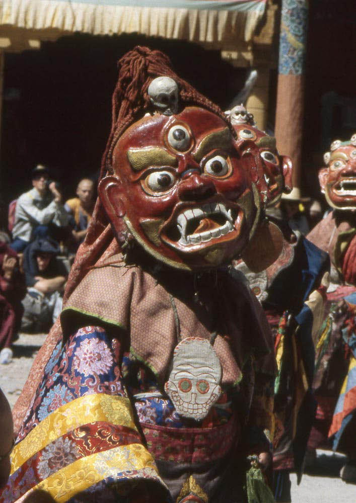 Six moines aux masques figurant les démons de l’enfer, chaussés de bottes de feutre et vêtus de robes de soie, s’affrontent en une danse rythmée par gongs et tambours. Les forces du bien arrivent ensuite pour affronter et triompher de celles du mal.