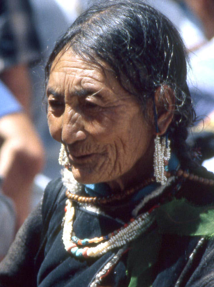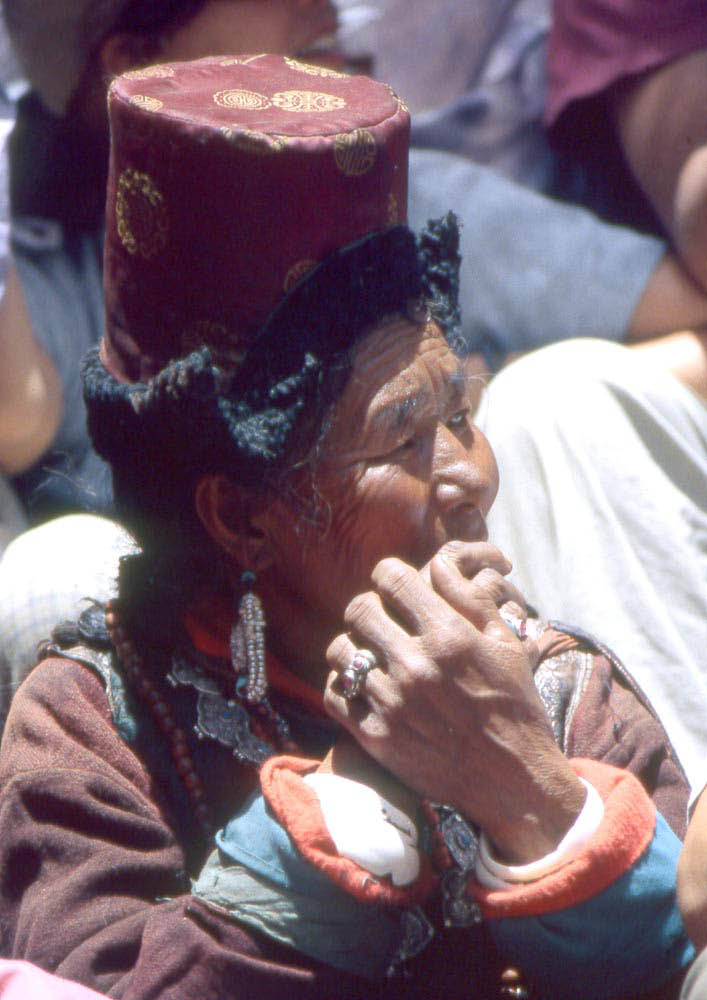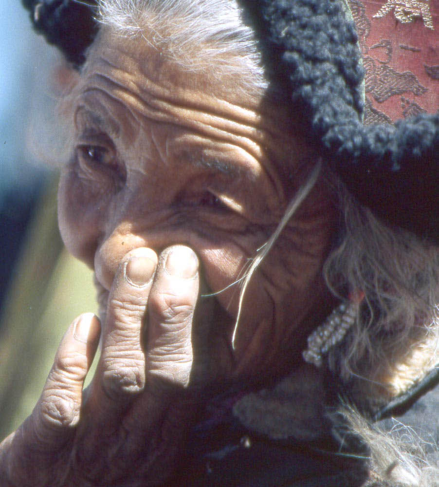 Les vieilles femmes, parées de leurs plus rutilantes « chuba », longues robes de boutonnées sur le côté et de leurs insolites coiffes ressemblant à des hauts de forme, font tourner inlassablement leurs moulins à prières.