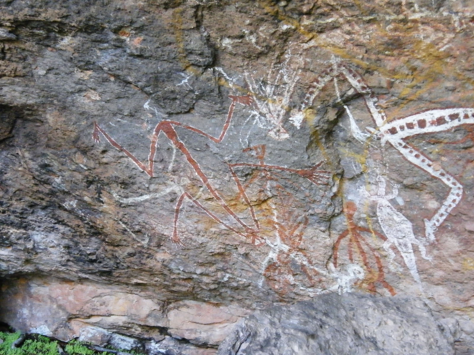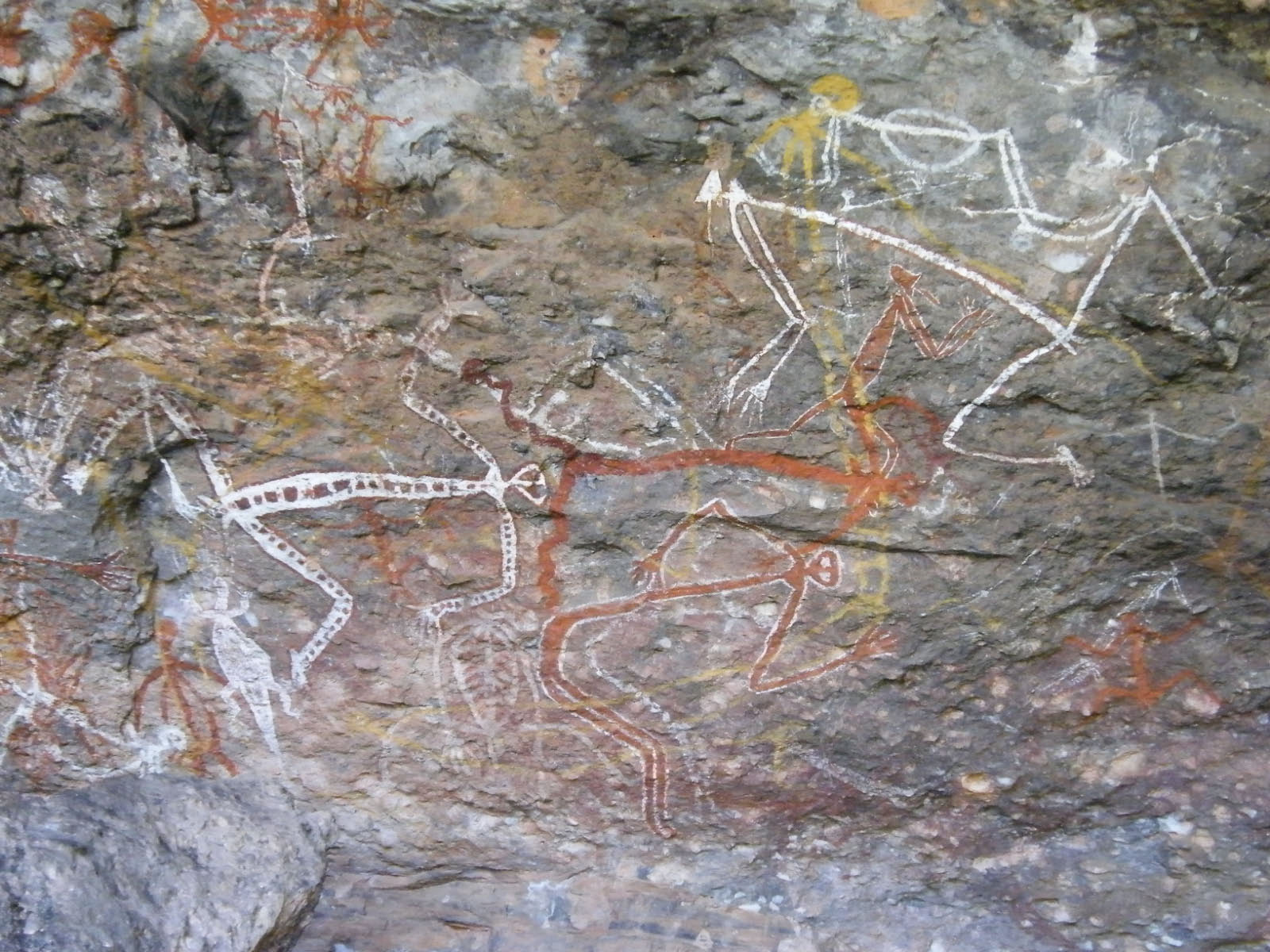 Les Aborigènes font partie de la même souche de peuplement que les Papou de Nouvelle Guinée. Les très nombreuses langues et dialectes des uns et des autres font partie du groupe des langues Papou. Ces groupes refluent vers le centre des terres où ils développent des cultures et des langues très différenciées (qu’ils soient papoues ou aborigènes) et où naquis un art rupestre singulier ( particulièrement en Australie).