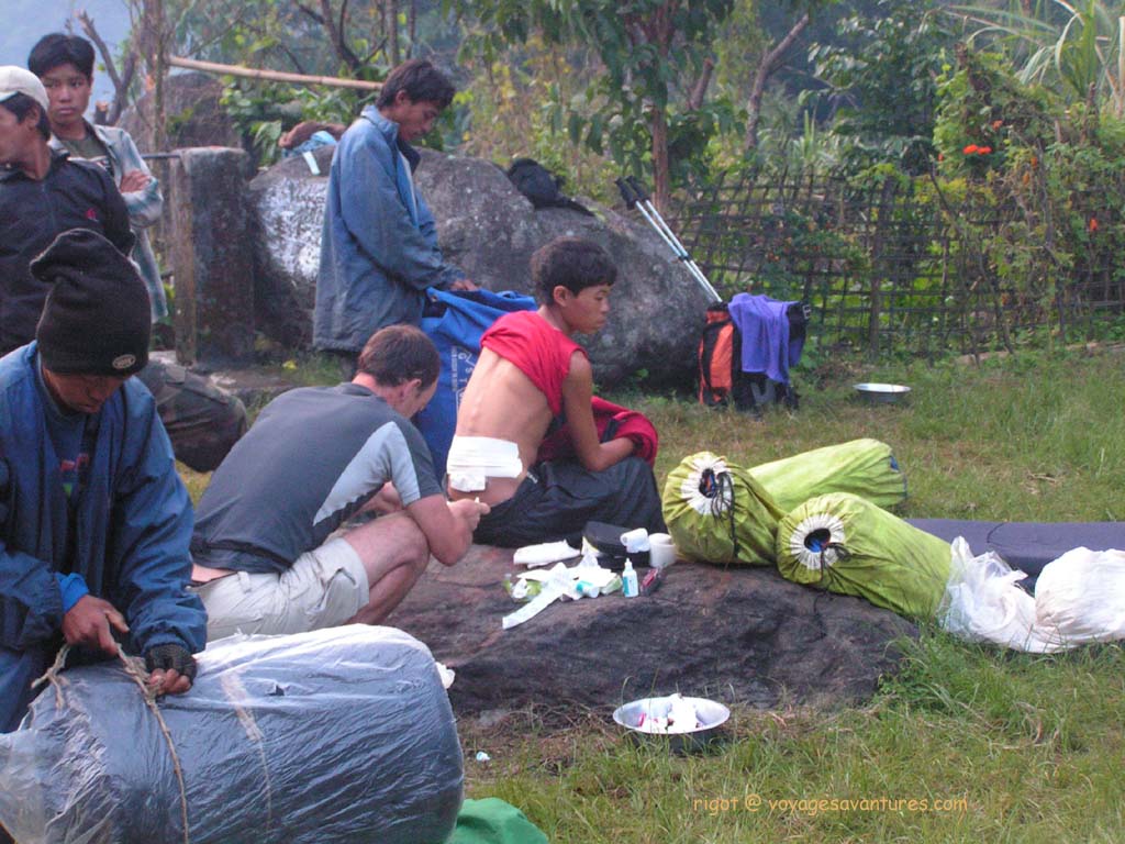 Sur les douze porteurs qui nous aidèrent à boucler le tour du Manaslu, la moyenne d'âge tournait autour des 20ans, et trois étaient malades ou blessés. Des blessures aux pieds ou au dos, ont des fois bien du mal à guérir. Plusieurs d'entre eux ont été soignés par les amis médecins du trek. Il leur fallu traiter des furoncles effrayant dans le bas du dos, ou des infections de pieds, tout autant que les conséquences du mal des montagnes (œdèmes, vomissements,) auxquels ils sont pas plus habitué que nous. N'oublions pas qu'au Népal, ce n'est pas un loisir que d'aller en montagne. Pour les habitants des vallées, il n'y a pas d'utilité à y aller et encore moins à gravir les sommets, qui de plus, sont le plus souvent des demeures des dieux.
