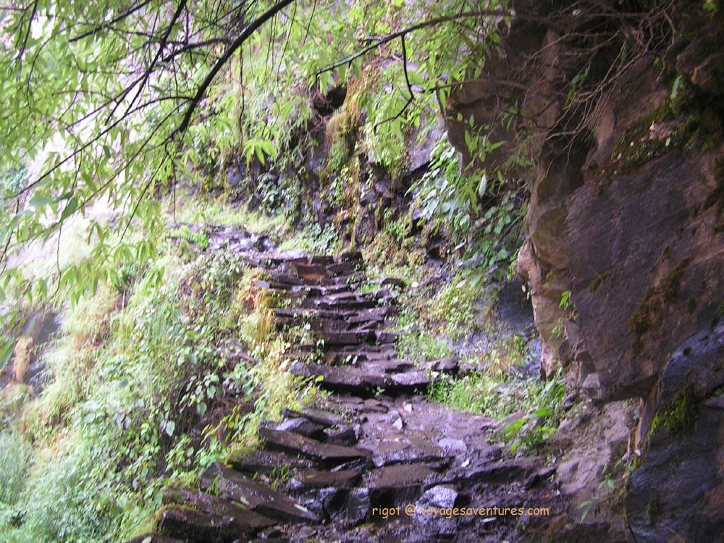 Pour aider les porteurs, des reposoirs (Chotara) sont aménagés régulièrement à l'ombre d'un couple de ficus. Des milliers et des milliers de marches ont été assemblées dans les passages les plus raides, et ils sont très nombreux. Dans ce pays souvent humide, il est plus aisé de se déplacer, surtout lourdement chargé sur des « chemins de marches » , même irrégulières que sur des sentiers glissants et moussus.