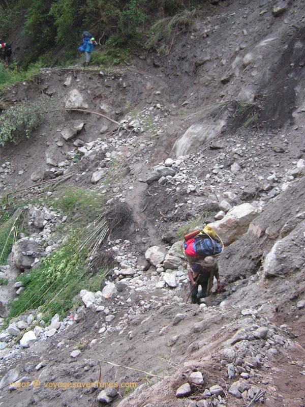 D'une rive à l'autre de longs ponts suspendus permettent de rechercher le versant le moins exposé aux chutes d'eau, aux glissements de terrains fréquemment ravageurs à la période de mousson, ou les escarpements vertigineux.