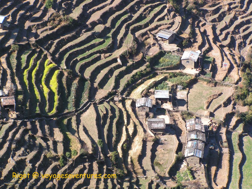 Le Népal est couvert de cultures en terrasses. Jusqu'à plus de 4000 m d'altitude, les hommes ont réalisés des travaux titanesques, pour façonner la montagne, afin de pouvoir cultiver leurs maigres rations de riz, de blé dur, ou d'orge.