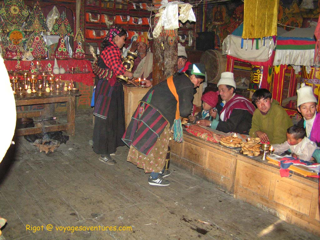 Cérémonie de la fin des moissons dans la gompa (lieu de culte). Distribution du "fameux" thé au beurre. Il n'est pas obligatoirement rance.