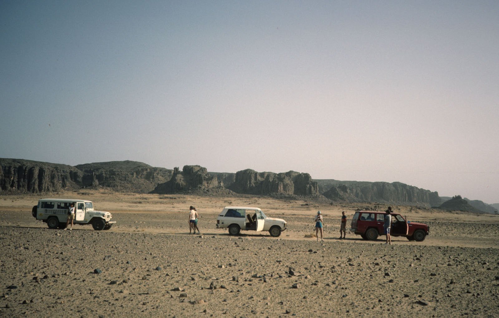 Parti de Marseille en ferry pour Tunis, nous passons en Algérie à Constantine, puis la traversée des Aurès, la descente à travers les puits de pétrole d’Hassid Messaoud, puis In Amenas, Illizi, le plateau du Fadnoun, pour atteindre Djanet ! De là, à la suite de la rencontre de Rhibba et de son oncle Mohamed, c’est hors-piste (ou en suivant la piste des Touaregs) que nous gagnerons Tamanrasset.