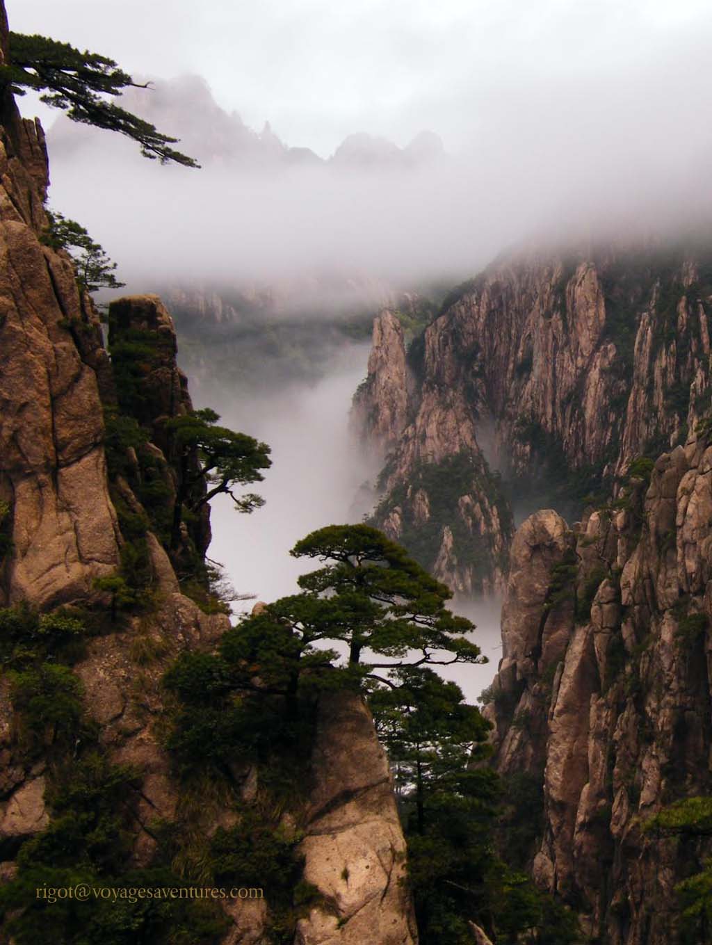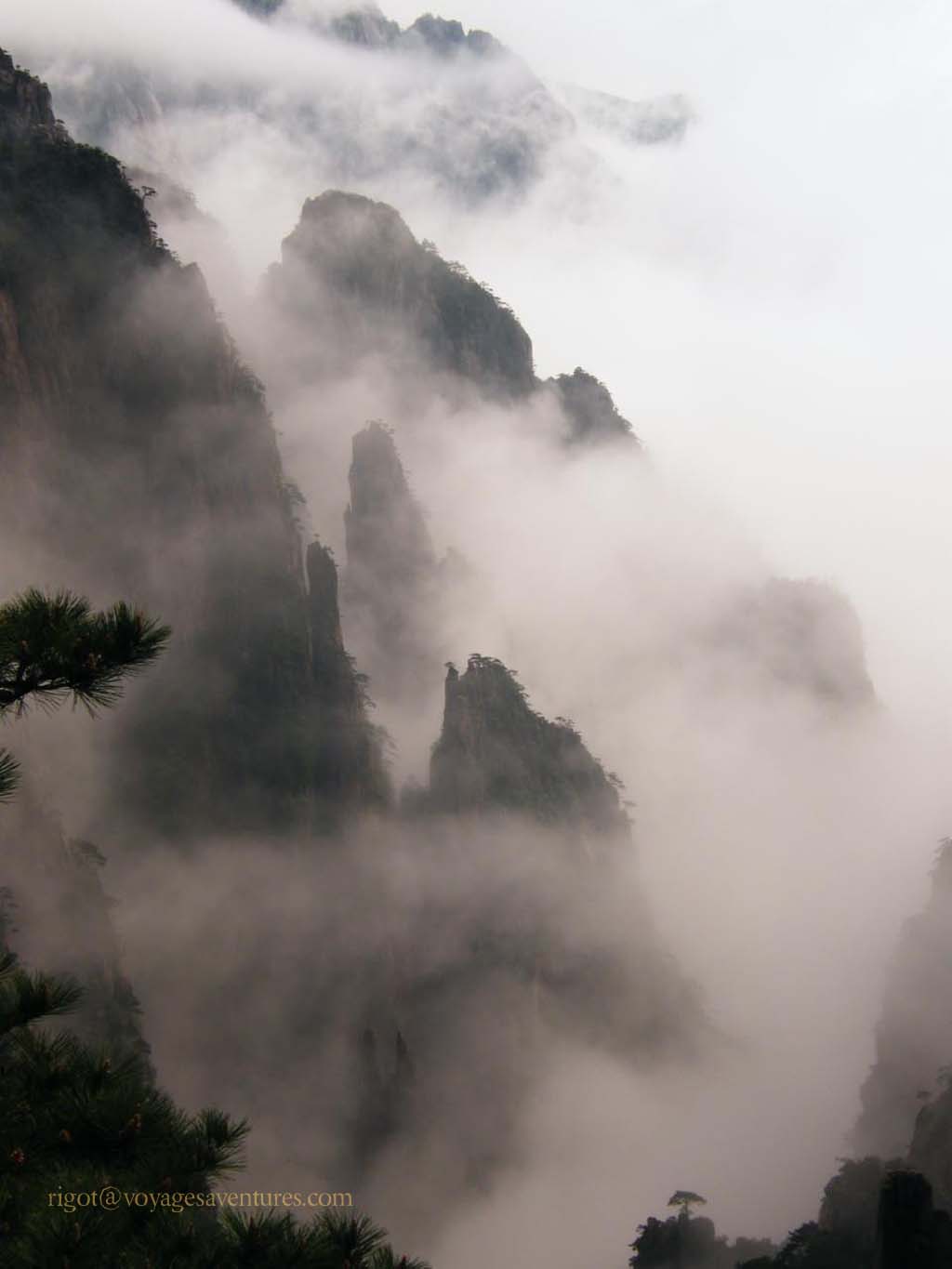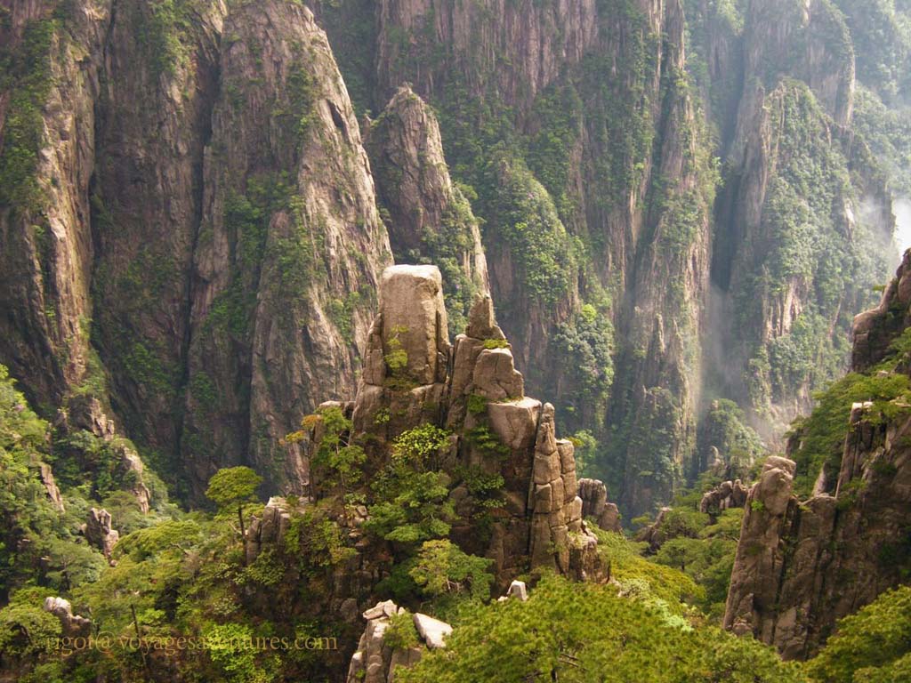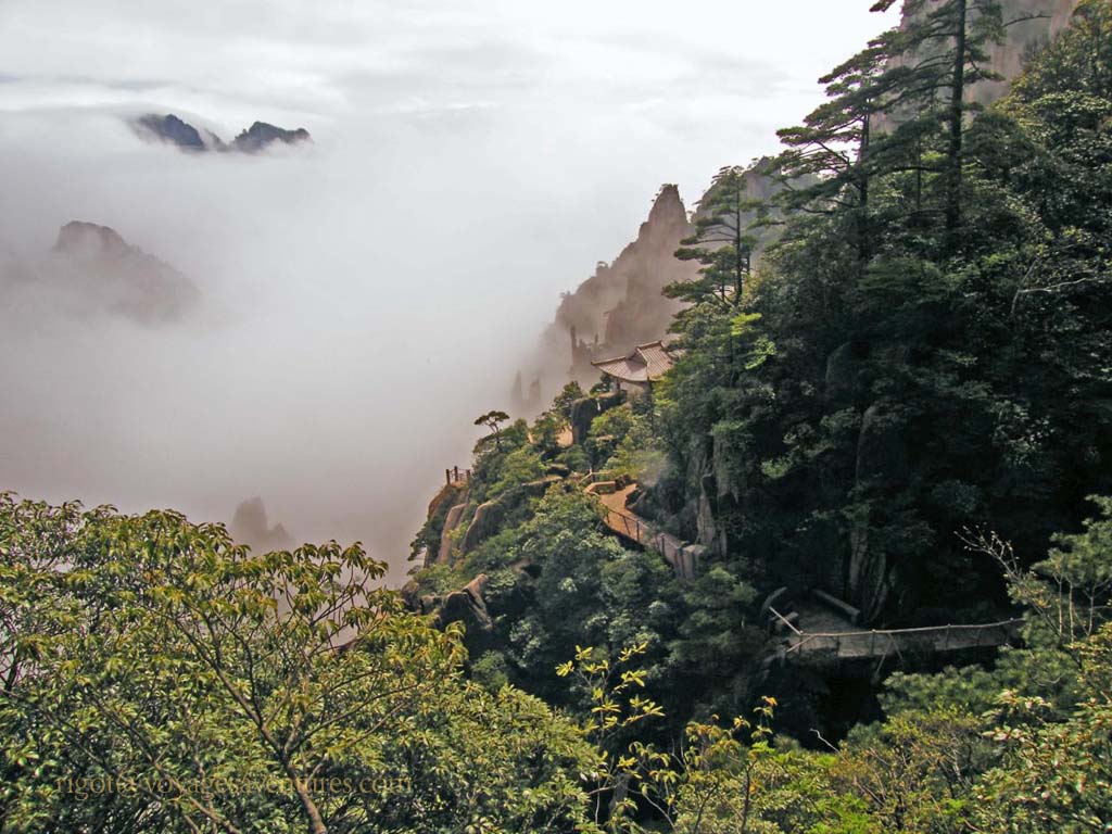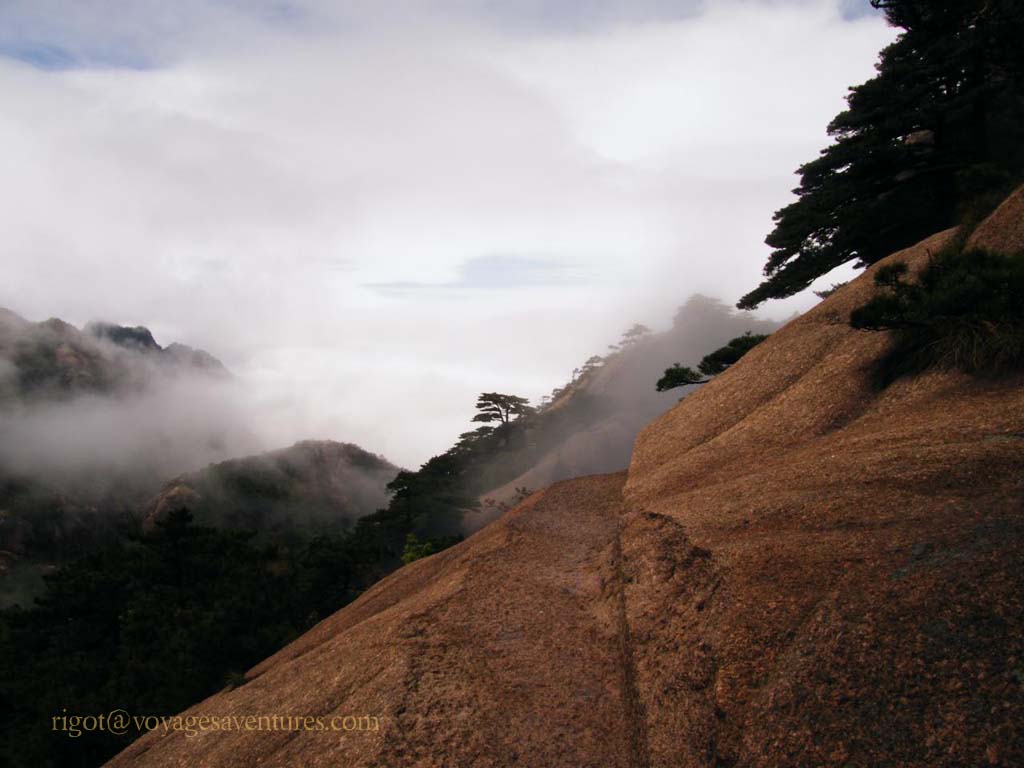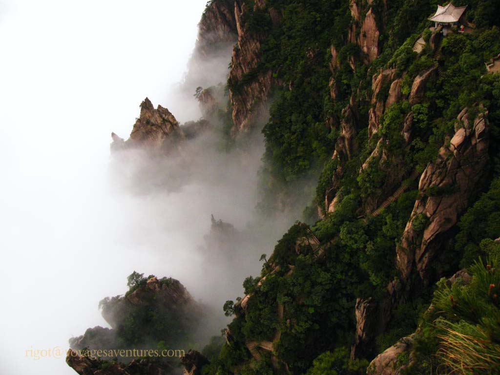 Le Huang Shan est un massif granitique extraordinairement découpé situé à 250km au sud-ouest de Shanghai, dans la province de Anhui. Plus de 70 pics entre 1000 et 2000m d'altitude émergent le plus souvent d'une mer de nuage ou déchirent la brume dans des paysages d'une étrange beauté.