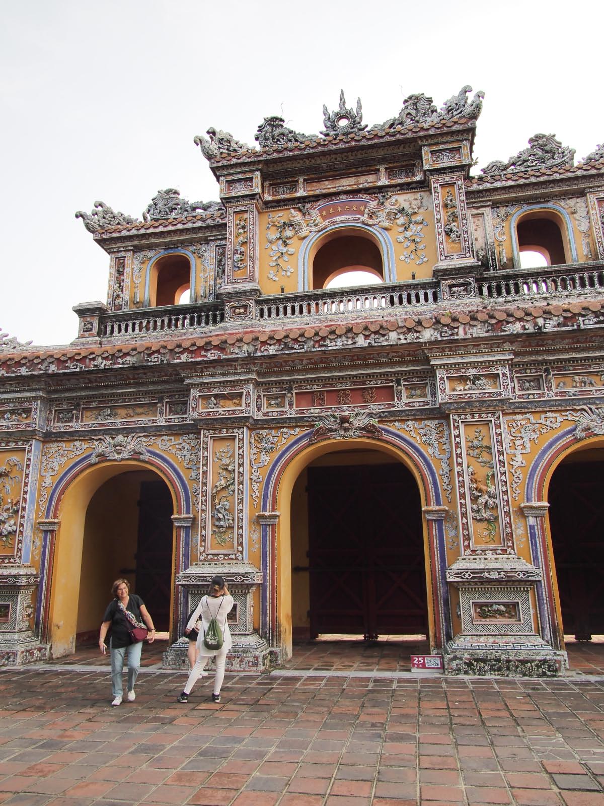 Nous visitons ensuite la spectaculaire citadelle. Bâtie sous le premier empereur Gia Long au XIXe siècle, elle est entourée de murailles "à la Vauban", de fossés, de canaux, de bastions où nous retrouverons une inspiration française. Elle a hélas été très détruite lors de l’assaut de la fête du Têt, par des bombardements américains intensifs, pour tenter de repousser une occupation surprise de la ville par le Viet Min. De gros travaux de reconstruction ont été entrepris pour tenter de redonner son lustre a une « cité interdite » siège des derniers empereurs du Vietnam