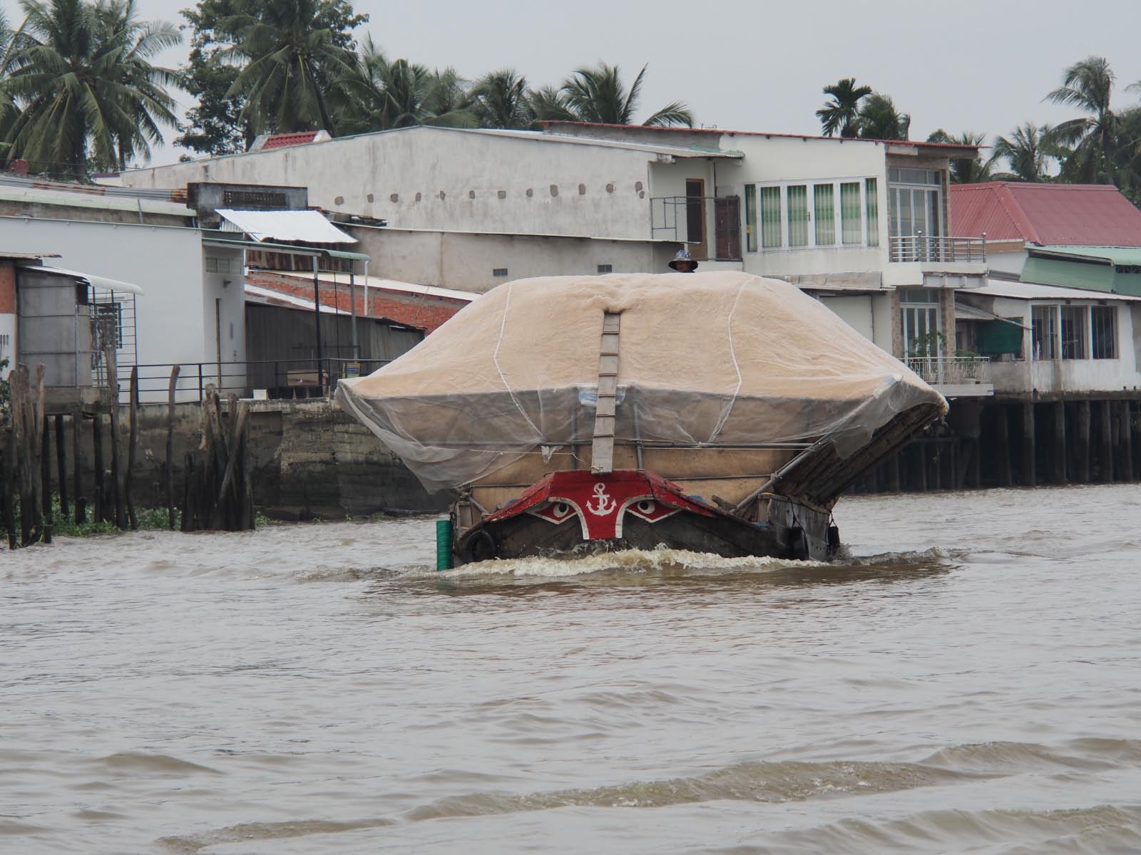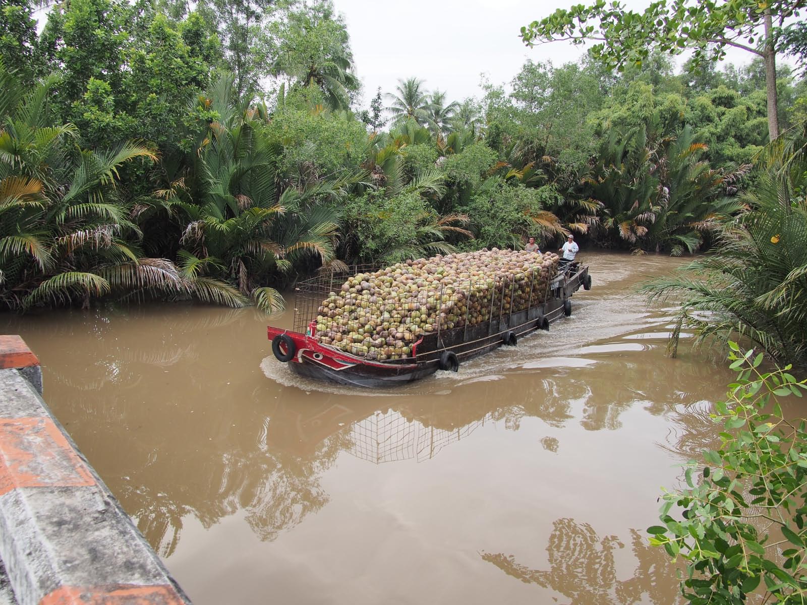 Le delta du Mékong, immense rizière parsemée de nombreux jardins et traversée en tous sens par des voies fluviales sur lesquelles nous naviguons. Un vaste réseau de milliers de canaux caractérise la vie dans le delta du Mékong qui s’étend sur quarante mille kilomètres carrés. La couleur jaune de l’eau est due à la terre qui fertilise tout au long de l’année les champs et les riches jardins fruitiers du delta. Les immenses rivières et les rizières sont parsemées d’étangs de lotus. Le moyen de transport principal est le bateau. Nous croisons, au cours de la croisière, de nombreuses petites embarcations transportant fruits, fleurs, légumes et poissons.