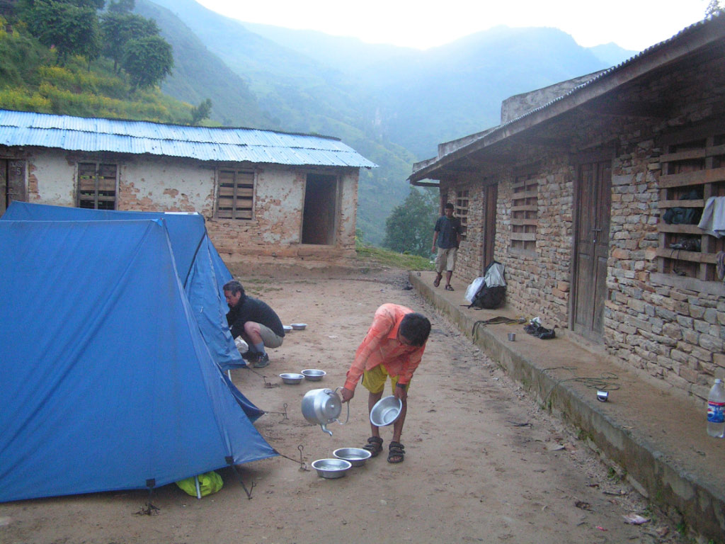 Le petit déjeuner est prêt une heure après le réveil. Il est bien sur copieux, œufs, crêpes, muesli, confitures, thé ou café. Pendant que nous dégustons notre premier repas de la journée, l'assistant guide et quelques porteurs commencent à démonter les tentes et il constitue les premières charges pour les porteurs. Nos sacs ont dû être bouclé au préalable. Nous n'en disposeront que le soir, et nous porterons dans nos petits sacs à doc le strict nécessaire pour la journée.