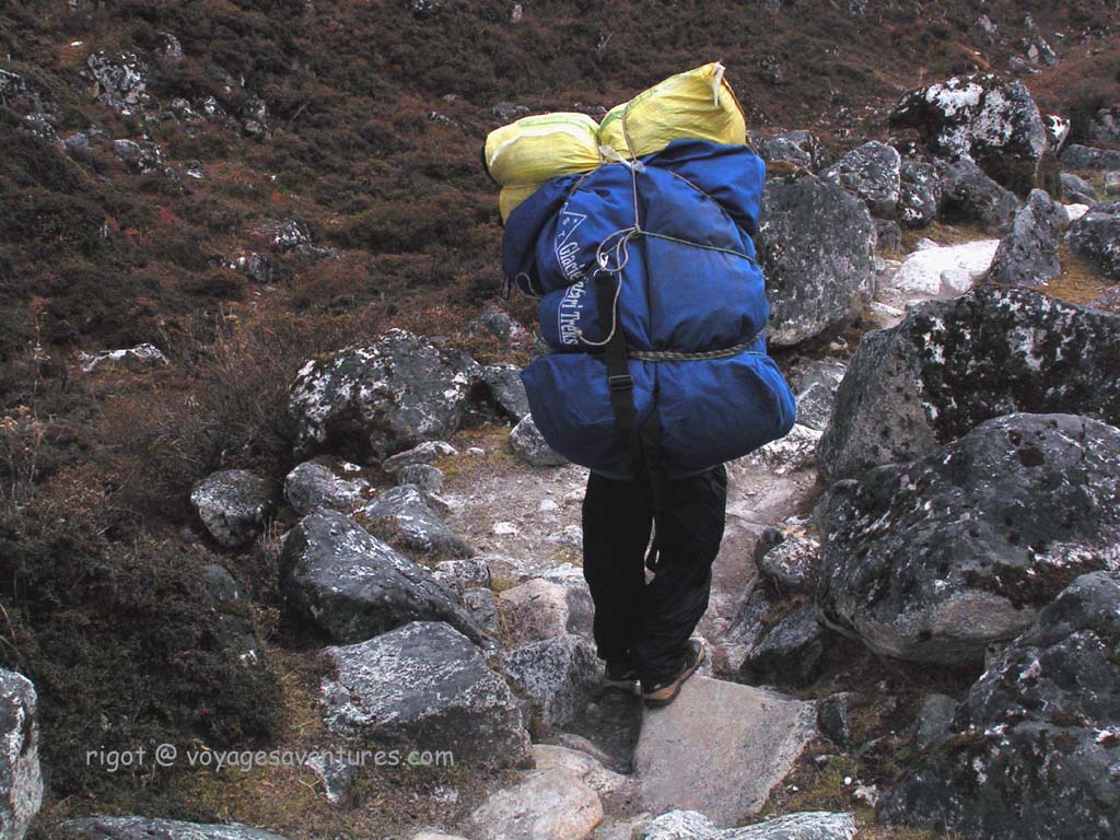 Depuis quelques années les agences de trekking doivent équiper les porteurs du minimum, pour franchir les zones des cols et ils disposent maintenant de chaussures fermées (pas toujours à leur taille) et des vêtements de pluie, pour la durée de la randonnée. Ce qui n'était pas le cas lors de mes premiers treks il y a 25ans, où il n'était pas rare de croiser des porteurs en short et pieds nus ou en tongs dans la neige.