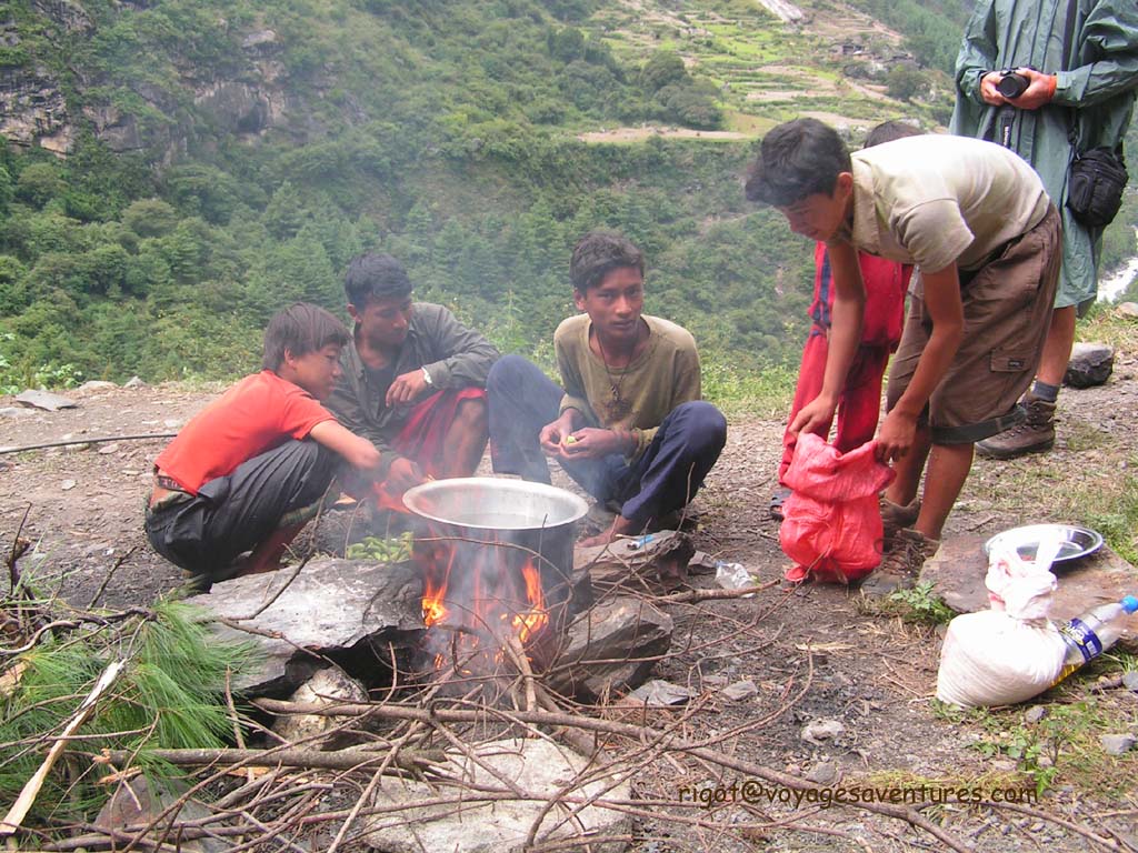 Au cours du trek, en sus de la charge qui leur est affectée tous les matins par le sirdar (le chef d'expédition), les porteurs ont à porter leurs propres baluchons, bien léger au regard de nos gros sac, et le minimum nécessaire à la cuisson de leur riz ou de leur propre nourriture. Durant le trek les porteurs doivent subvenir eux même à leur repas et trouver leur hébergement, soit dans les villages traversés, soit en partageant une des tentes « mess » du campement si le bivouac est installé loin des habitations.