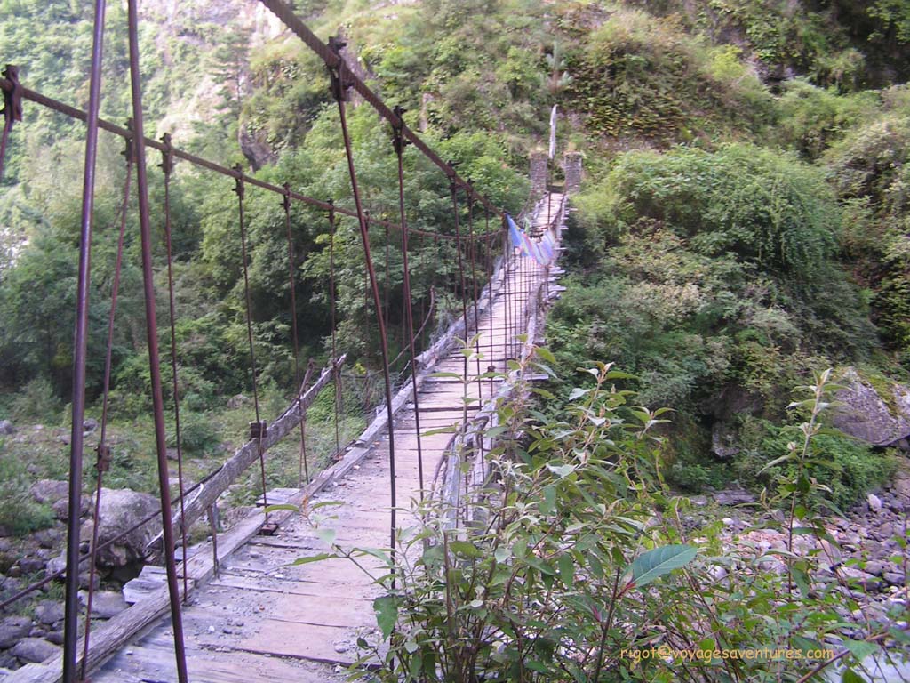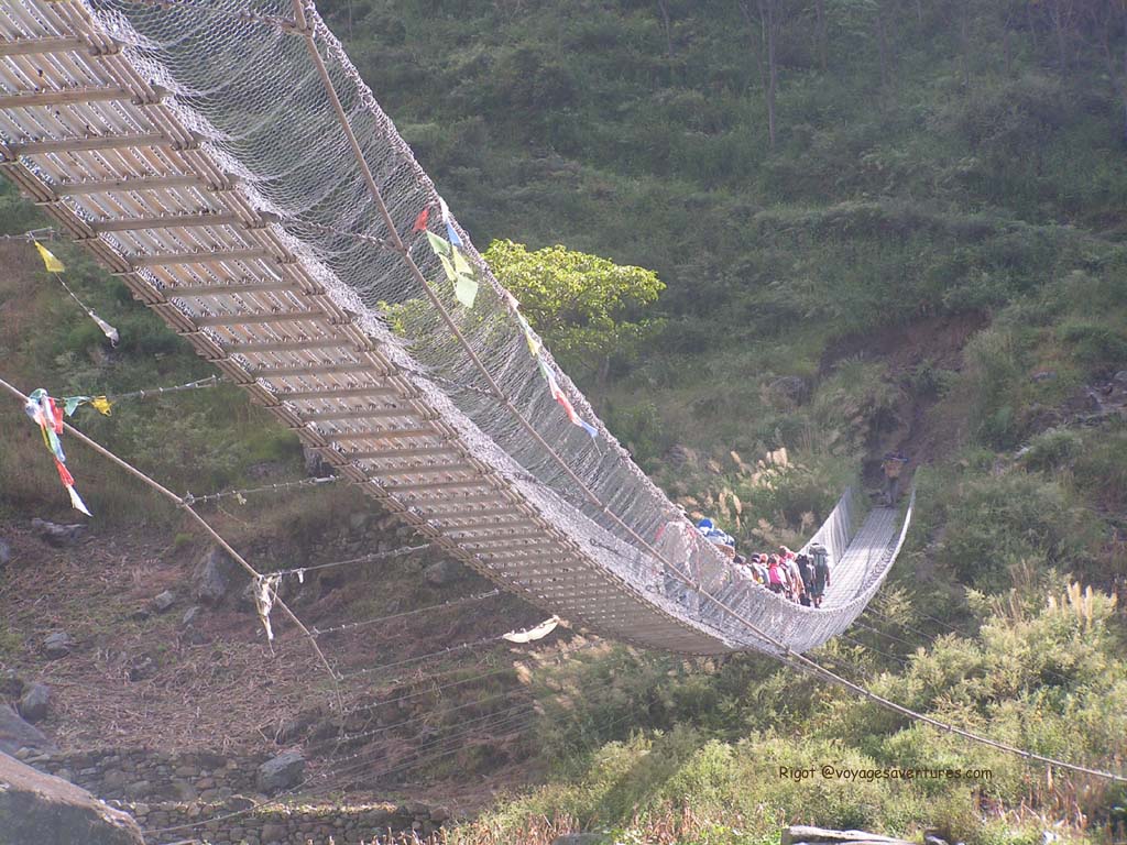 Les ponts ont toujours constitués des ouvrages critiques dans ces régions. Autrefois en lianes, cordes de Yak et planches, ils sont maintenant fait de câbles d'aciers et ont des tabliers en caillebotis métalliques. Leur franchissement n'en est cependant pas moins spectaculaire. Certains dépassent les 100m de longueur au-dessus de torrent oh combien tumultueux. Même convenablement haubanés, le mouvement incessant du tablier sous les pieds, nous rappelle que la structure est légère.