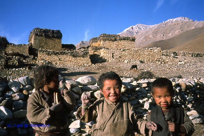 Situé, à 4000m, en haut de la vallée de la Tarap, il ne regroupe que quelques familles qui subsistent difficilement. Aucun ravitaillement n'est possible pour nous. Nous sommes parti de Dunaï avec 14 porteurs et toute la logistique pour 18 jours. Pour nous adapter à l'altitude, nous resterons une journée entière à DO. Ce qui nous permis de faire mieux connaissance mutuelle avec la population et assister aux premières cérémonies religieuses Tibétaines. Le village abritait encore des adeptes de l'ancienne religion Bhon, aux origines pré-boudhiste.DO