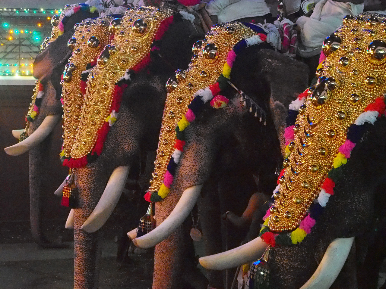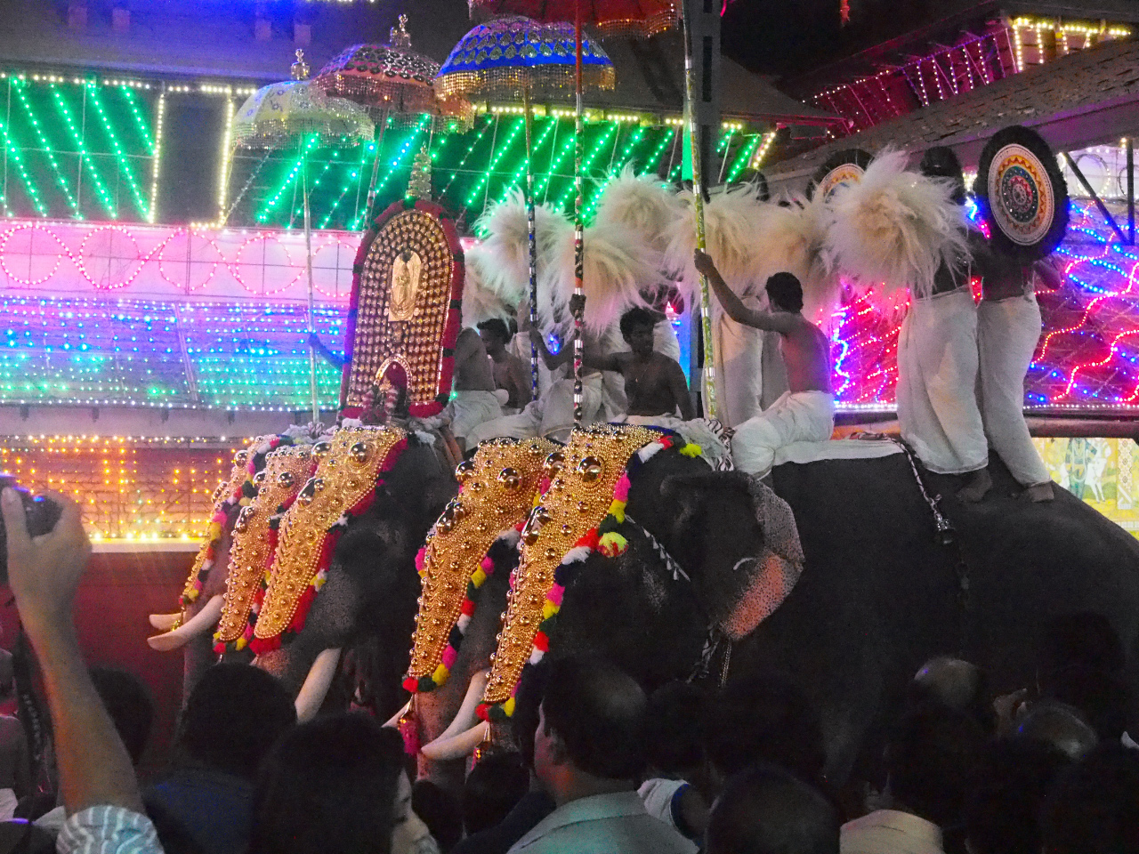Sur le dos de chaque animal se tiennent 3 personnes : la première maintient une ombrelle de soie, la seconde agite les venchamarams (sorte de pompons), et la dernière porte les alavattams (ronds orné de plumes de paon)