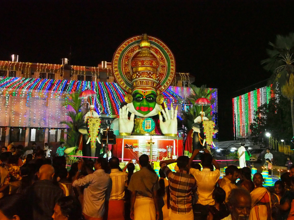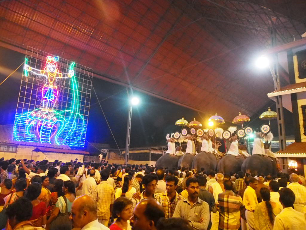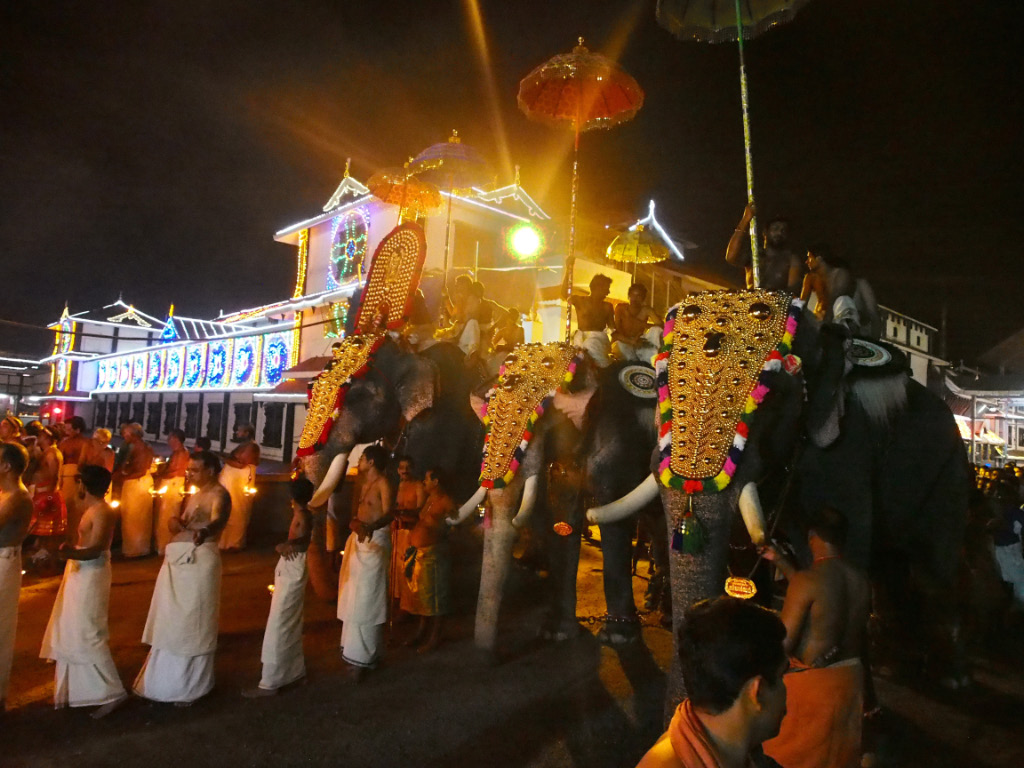 Fin mars/début avril, durant le mois indien de Medom (avril-mai), ont lieu au Kerala de grands rassemblements (Pooram) à la fin des moissons du riz. Le plus connu se tiens à Thrissur mais c’est dans la ville voisine de Guruwajur que j’ai eu la chance d’assister par hasard à la procession qui clôture la semaine de festivités.