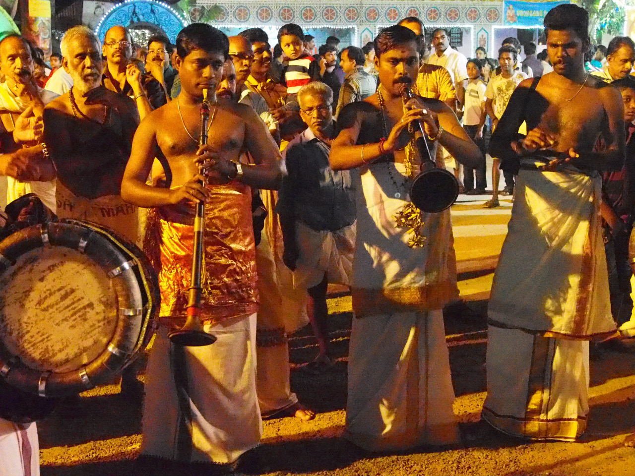 La parade est rythmée par des orchestres composés de tambours, cymbales, flutes et kombu (le panchavadyam)